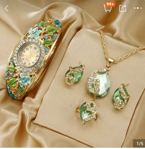 Vintage 4PCS Watch Gift Set Fashion Flower Green Diamond Women Watch Quartz Ladies Watch